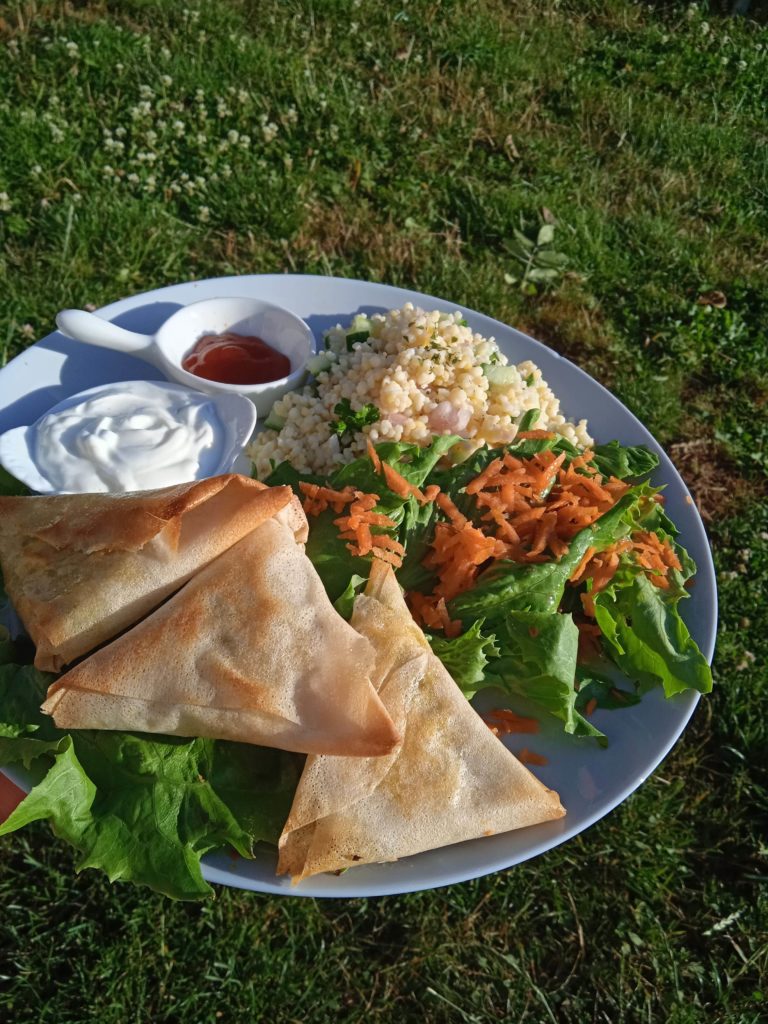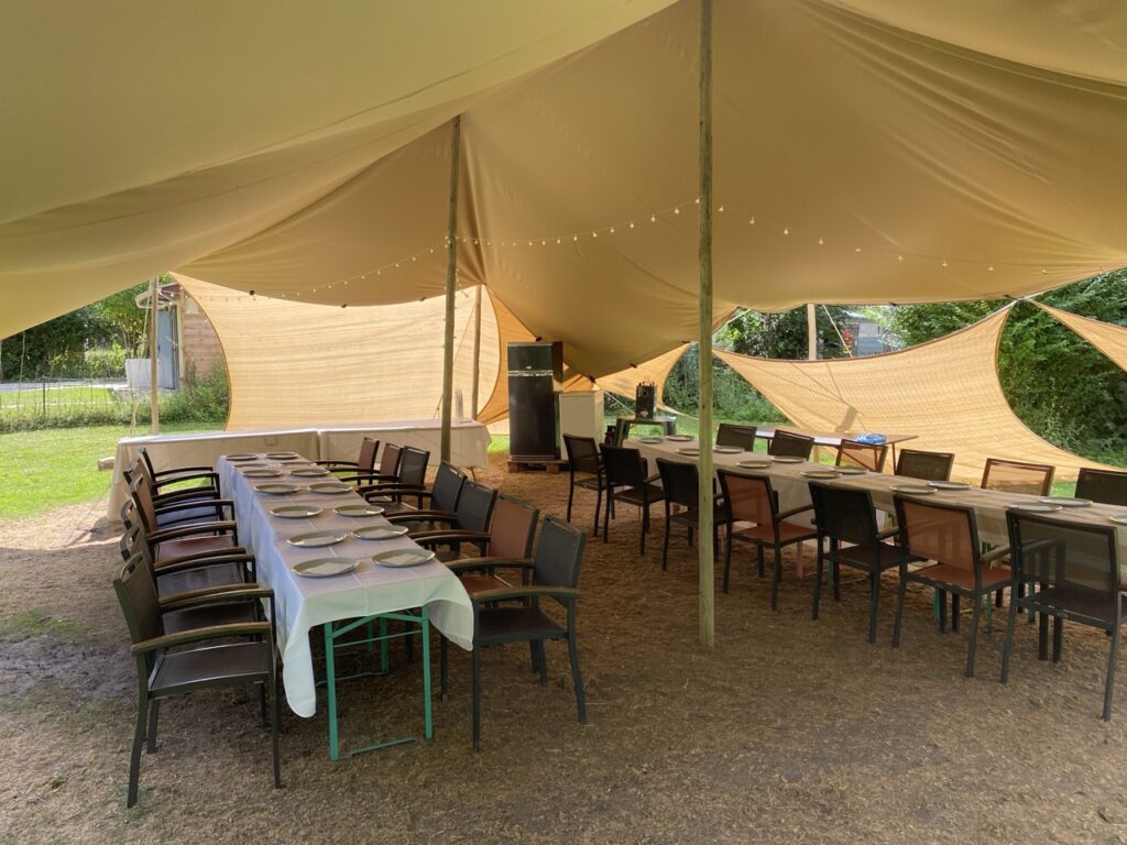 - Le Déjeuner « Super Adobe » (Jusque 30 pers.) : Service à l’assiette dans le dôme. Une cuisine de saison, majoritairement végétale et issue de notre jardin en permaculture.